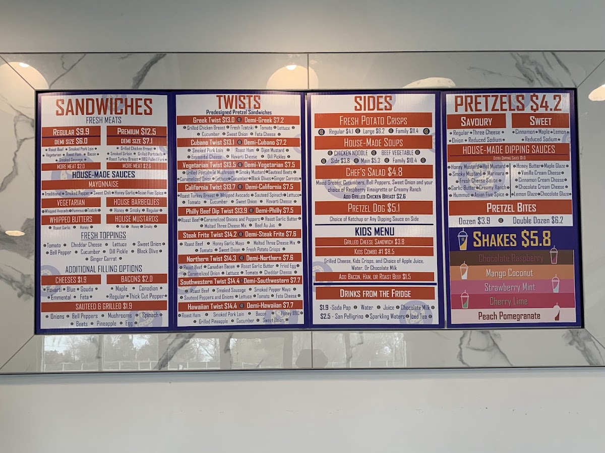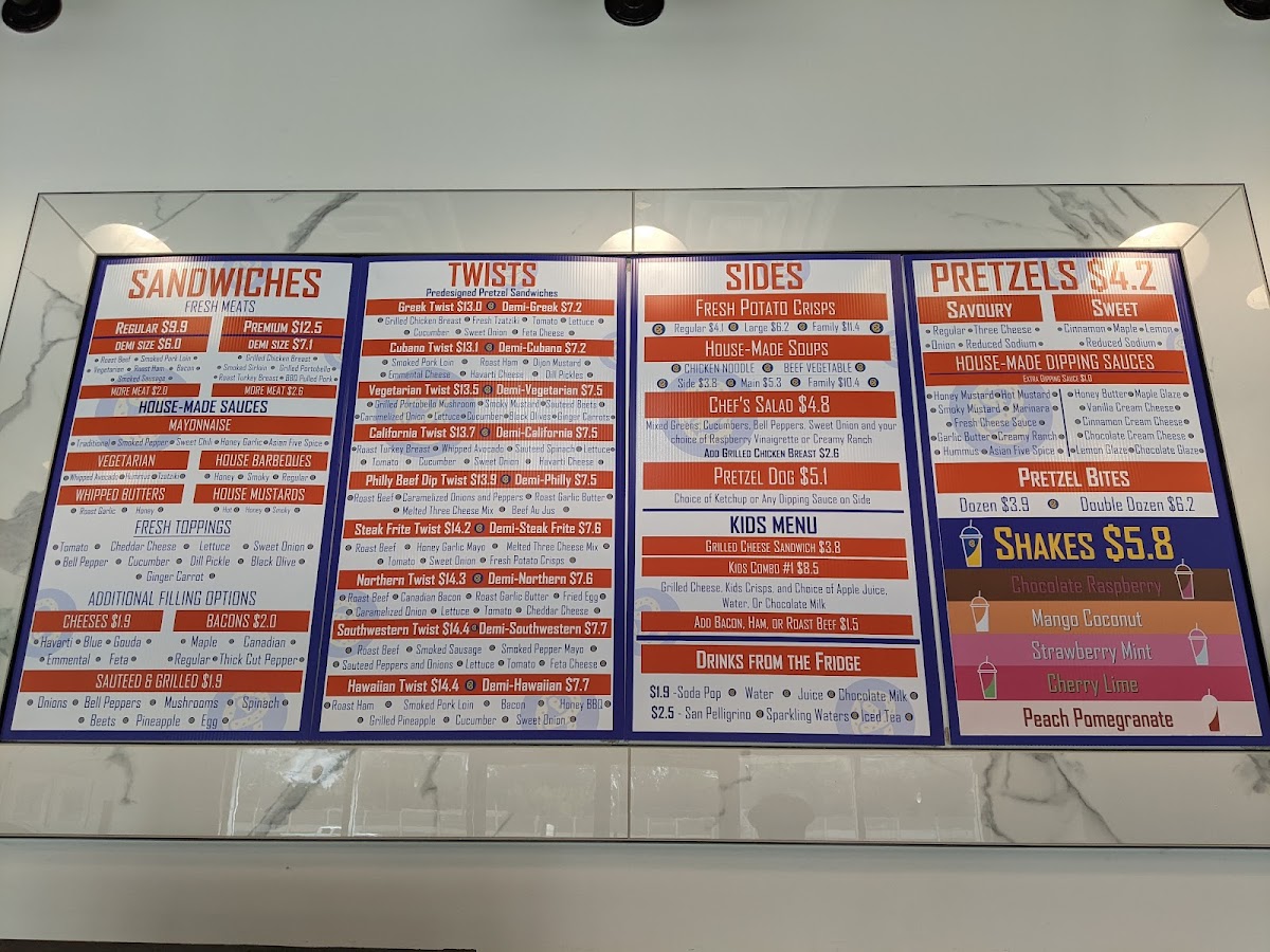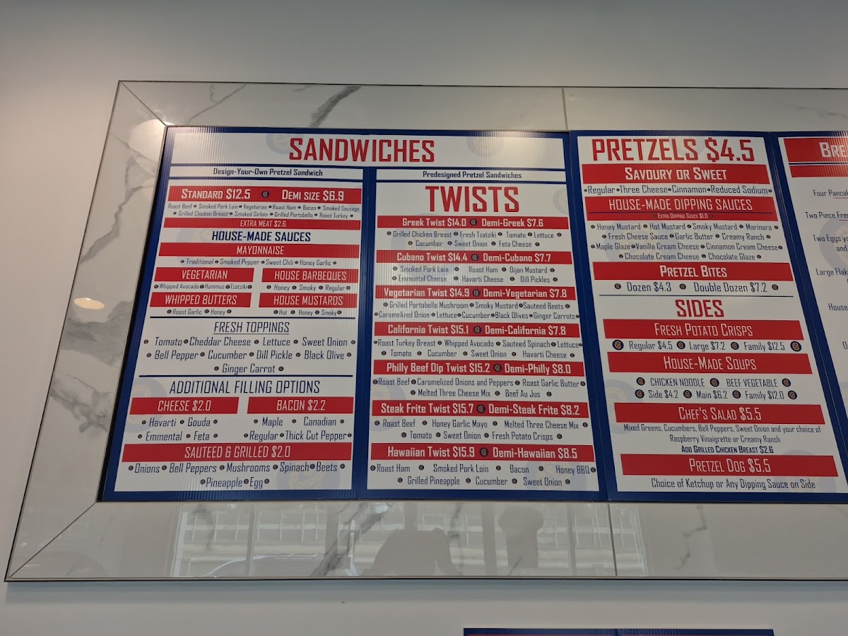 Ordered the Greek Twist, Philly Beef Dip pretzel sandwiches and a sweet pretzel today. We thought that the food was good but the dip with the Philly Beef Dip was extremely salty and the sweet pretzel was a bit crunchy. The chairs still had fingerprints and crumbs from the previous customer but the food and service made up for that. The prices are reasonable for a small restaurant such as this one and the restaurant has a decent location. Will have to come back to try some of their other pretzel sandwiches!